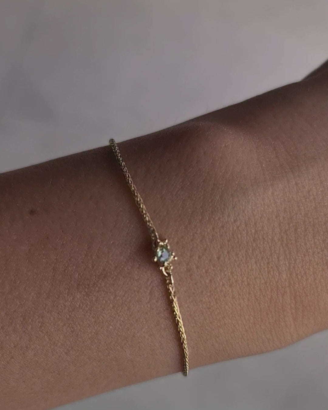 צמיד אלינה הוא חגיגה של עדינות ואלגנטיות. הוא משלב שרשרת זהב שזורה עם שיבוץ ייחודי, המדגיש את יופייה הטבעי של אבן הספיר ואת הנצנוץ המהפנט שלה.
