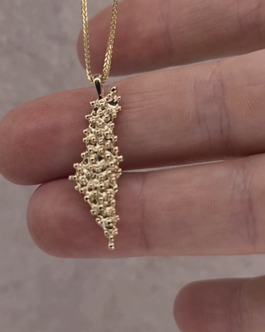שרשרת ארץ ישראל היא יצירה המשלבת עיצוב ייחודי עם משמעות עמוקה. התליון מעוצב בצורת מפת ארץ ישראל, עם טקסטורה ייחודית המשלבת גימור אורגני ודינמי.